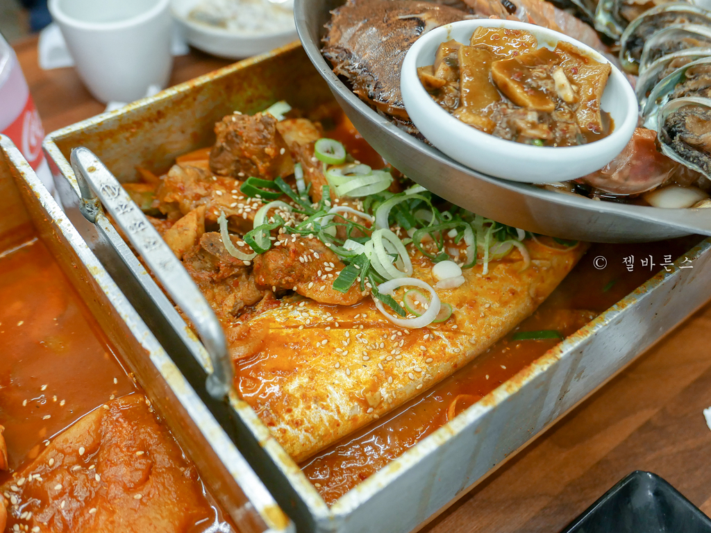 마치 항공모함을 본떠 만든듯한 커다란 철판틀안에 문어와 전복 해산물도 듬뿍 들어있고 엄청난 사이즈의 갈치가 통째로 들어있으니 순간 이걸 다 먹을수있을지 걱정이 되기도했다.