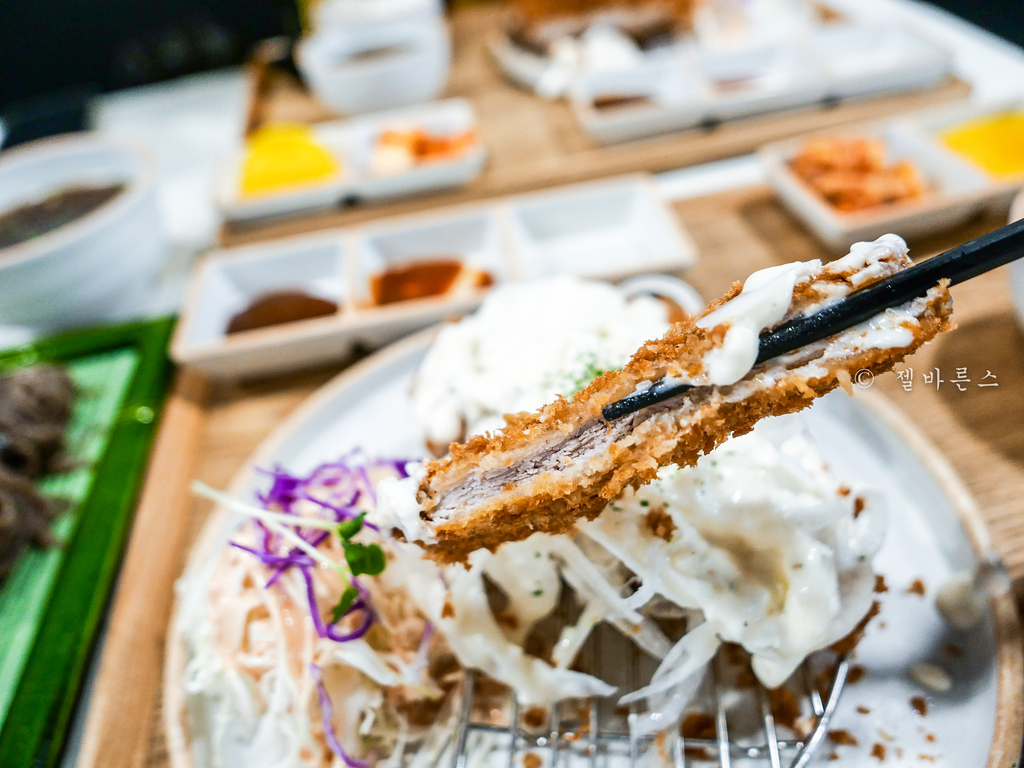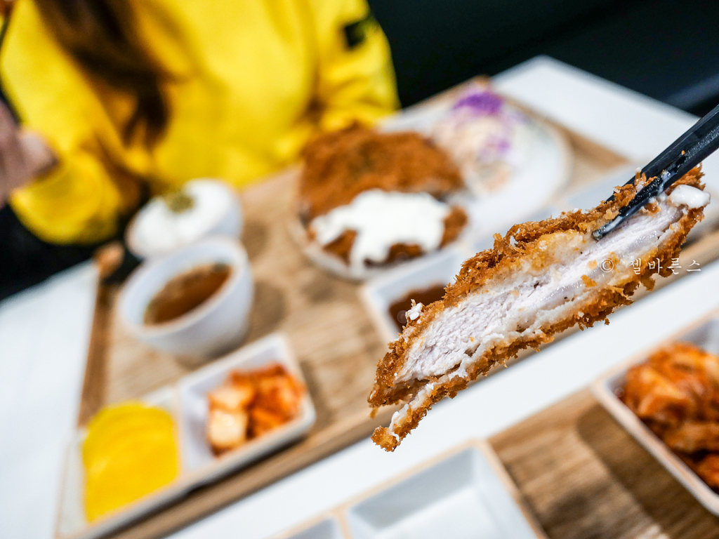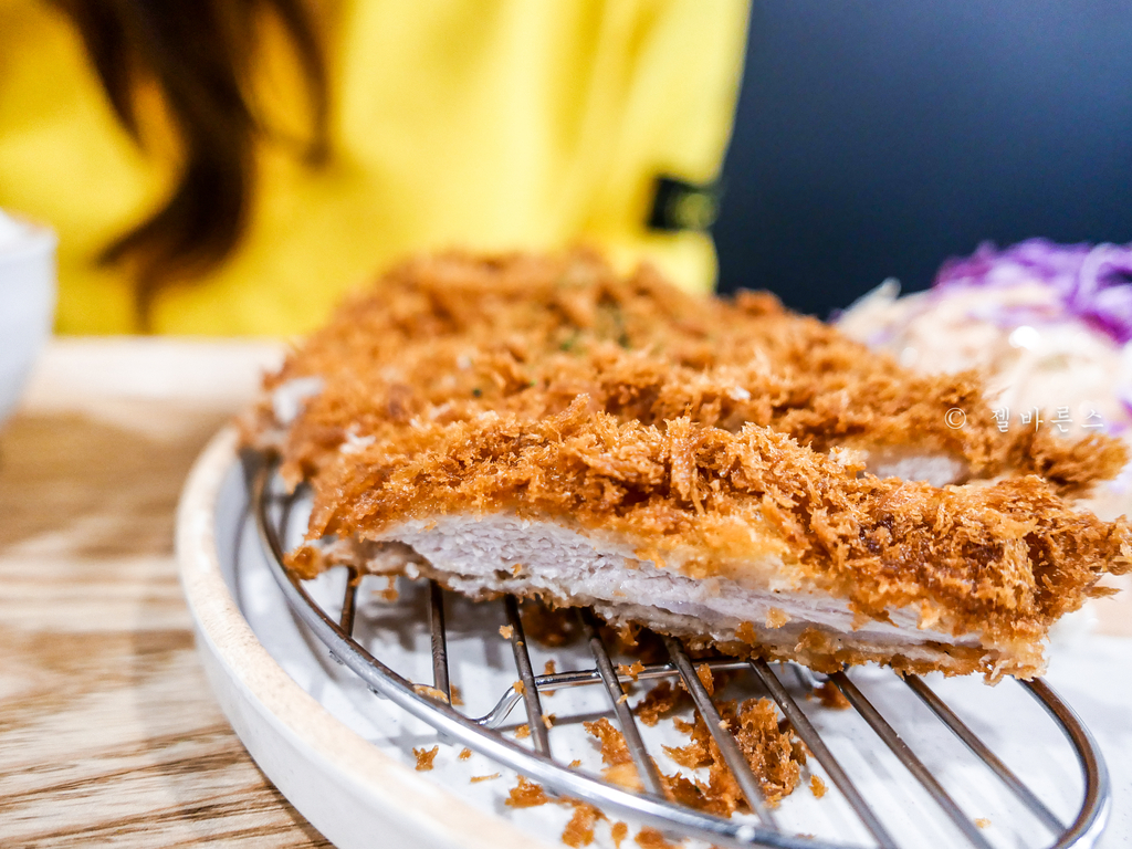 기본돈까스부터 한번 살펴보자. 사이즈도 크고 두툼하고 일본식 돈까스와 비슷한 비주얼을 하고 있었다. 한눈에 봐도 바삭해 보이는 비주얼에 그맛이 궁금해서 먼저 아무런 간을 하지 않고 먹어봤더니 예상대로 엄청 바삭하고 맛깔스러웠다.