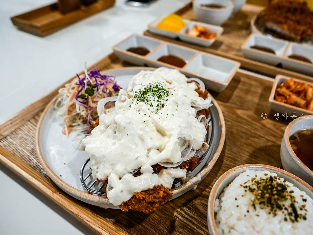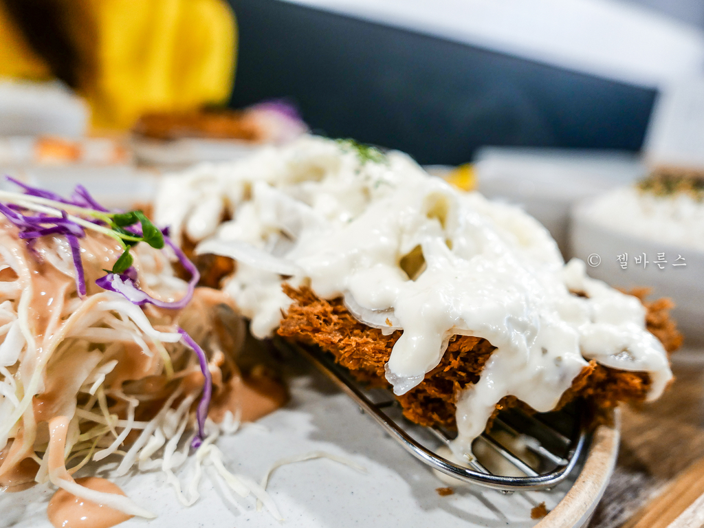이건 내가 주문한 어니언 돈까스.. 치킨집에서 일명 스노우 치킨이라고 해서 유행했던 그런 스타일이라 생각하면 되겠다. 마요네즈 맛과 상큼한 드레싱이 한데 어우러진듯한 화이트소스는 샐러드에도 잘 어울릴것 같다. 얇게 채썰어진 양파를 같이 토핑으로 올려놓았기에 양파의 알싸한 맛과 달큰함을 동시에 느낄수있다.