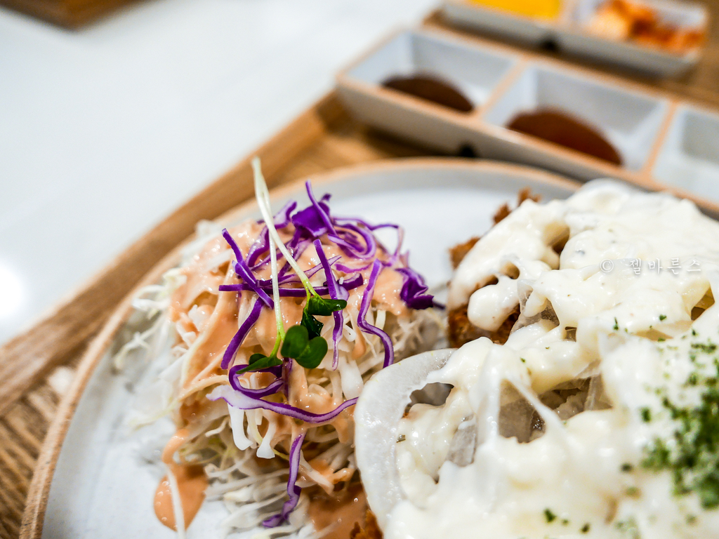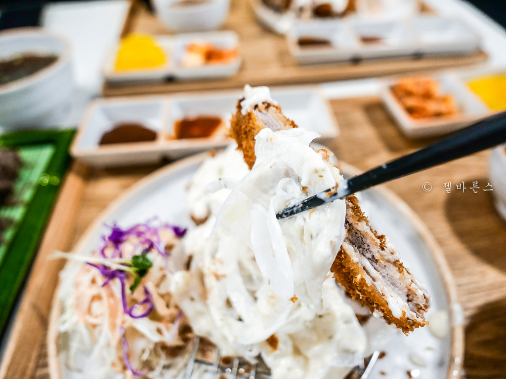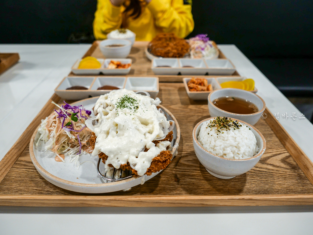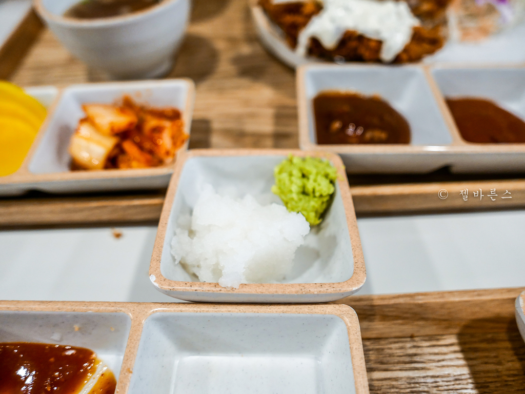 옛날 돈까스 처럼 소스를 뿌려서 먹는 타입이 아니라 테이블위에 올려져있는걸 따로 찍먹할수있도록 준비가 되어있다.