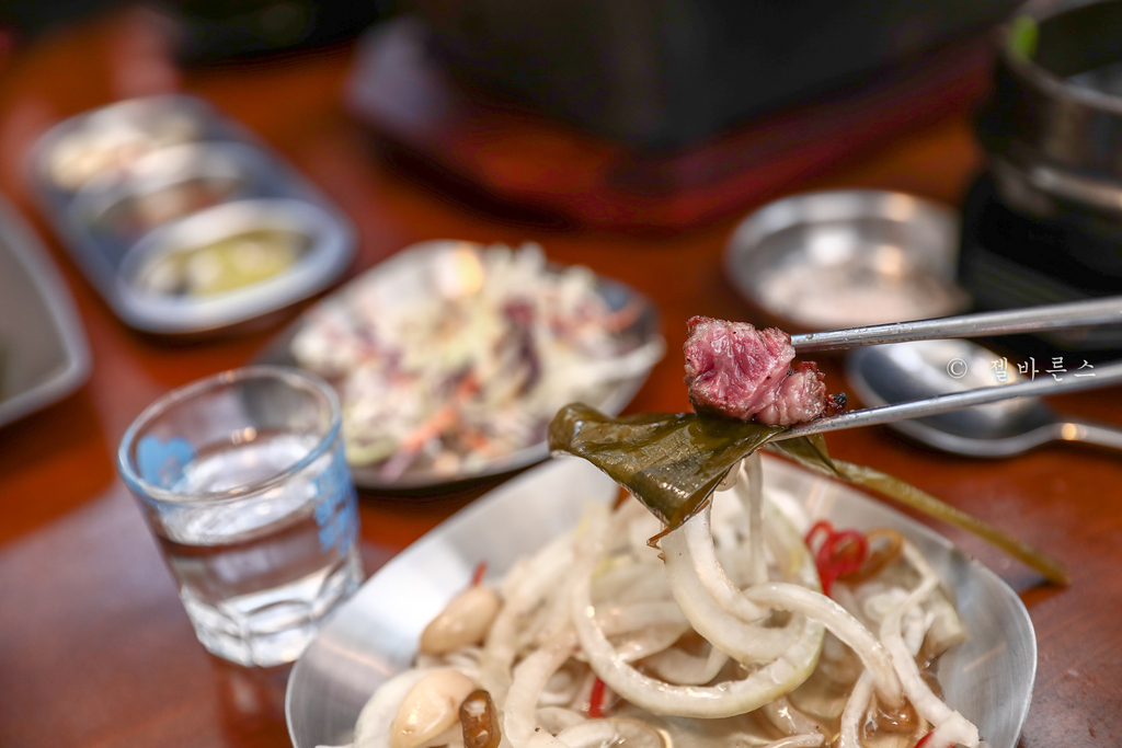 조금 덜익었을때 먹어야 더 부드럽고 육즙의 고소함을 강하게 받아들일수있겠다. 꾸덕한 식감에 새콤달콤한 맛의 명이나물도 온천천 맛집의 한우맛을 더욱 좋게해주는 역할을 톡톡히 해주었다.