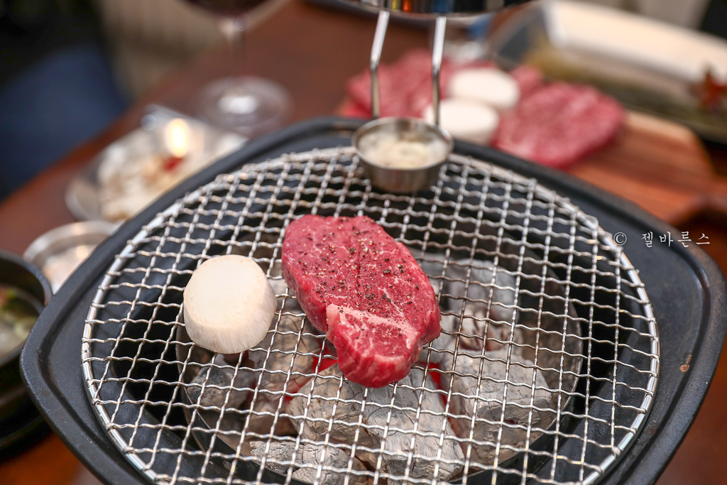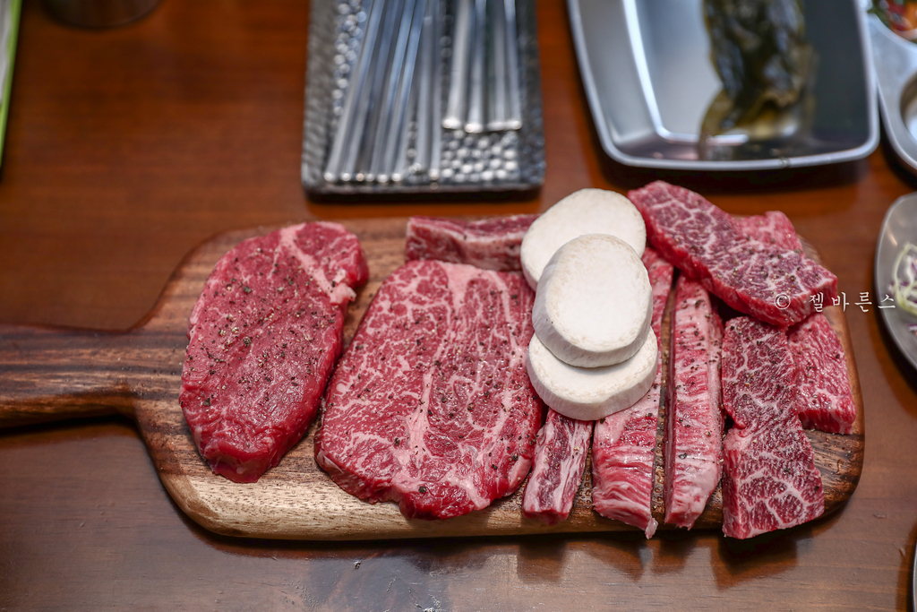 안쪽으로는 조금 넓은 좌석이 있고 테이블이 몇개 없지만 대신 다찌에 앉아서 먹을수있는 공간이 있어서 혼자와서 먹어도 괜찮을것 같은 분위기였다. 친구들이랑 오랜만에 한우를 먹을 생각에 카메라를 꺼내들고는 열심히 사진을 찍었는데 분위기가 다른 한우집이랑은 사뭇 달라서 데이트하기에도 좋아보였다.