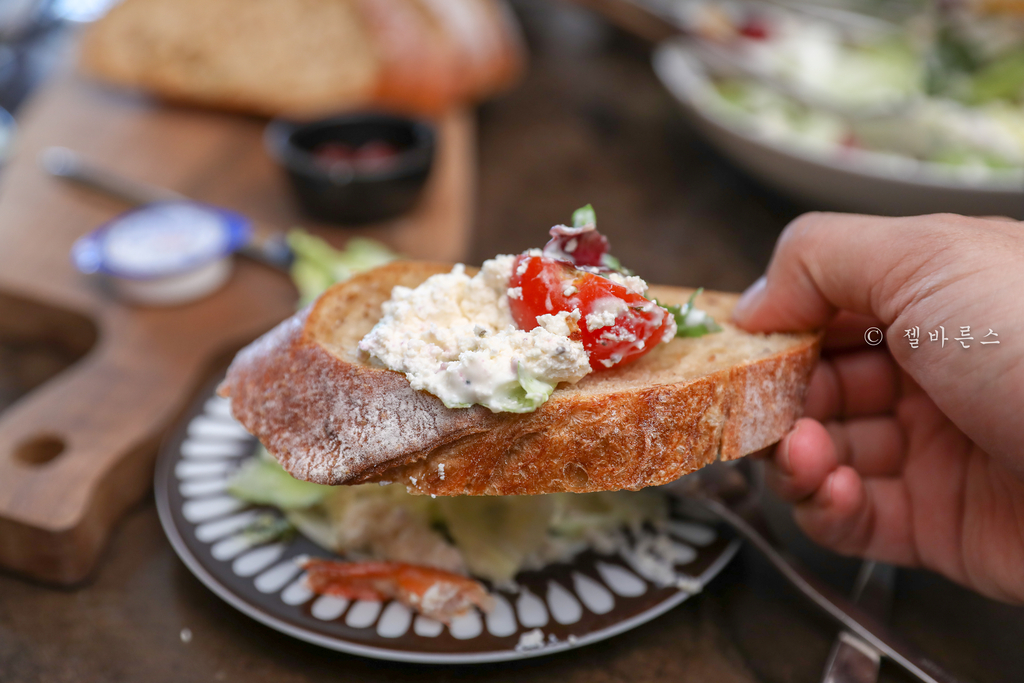 야채만 먹기 좀 그럴때는 빵위에 같이 올려서 먹으면 제맛이다. 아삭한 샐러드와 부드러운 바게트빵의 어우러짐이 인상적이었다.