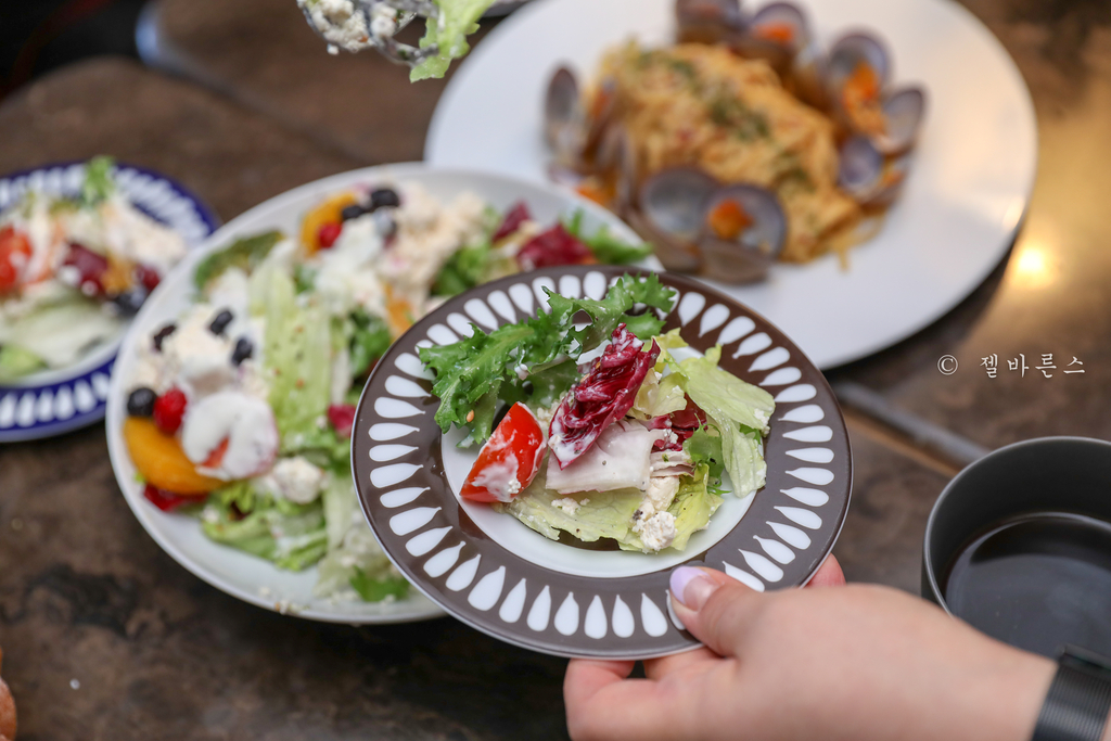 샐러드도 어설프지 않아서 좋다. 신선한 야채들이 한가득 들어있고 치즈도 듬뿍 들어있었고 블루베리에 통통한 새우까지 넉넉하게 들어있어서 식감도 좋은편이고 드레싱도 새콤달콤하고 젊은이들의 취향을 제대로 저격하는 기분이다.