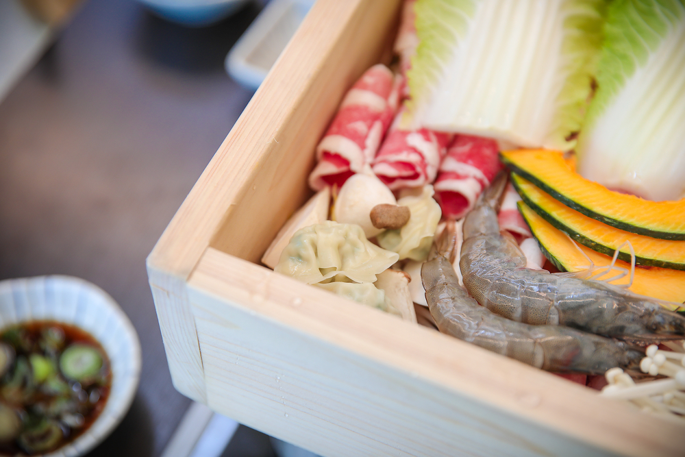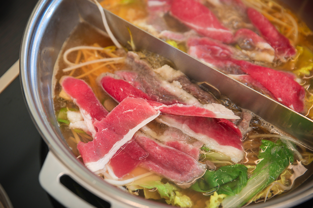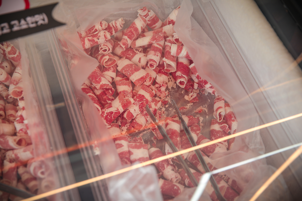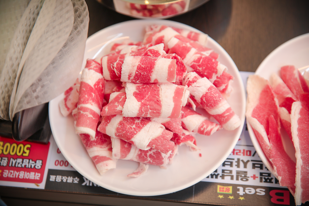 편백찜을 적당히 먹고나서는 직원분께 육수를 요청하고, 셀프바에 준비되어있는 고기들을 담아온다. 고기는 두가지로 준비되어있는데 쫄깃한 식감이 느껴지는 차돌양지와 고소한 맛이 느껴지는 우삼겹이있다.