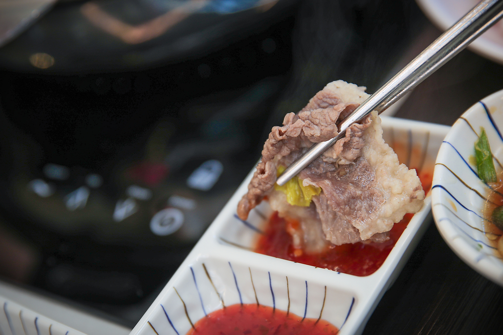 그 다음은 우삼겹을 담궈서 먹는데, 이건 아무래도 기름기가 좀 있다보니 오랫동안 담궈 먹기 보다는 빨리 건져내서 먹어야 더 고소한 맛이 느껴진다. 계속 담궈놓으면 육질이 질겨질수있고, 국물에 뜨는 기름기는 적당히 덜어주면서 먹어야 덜 느끼하다.