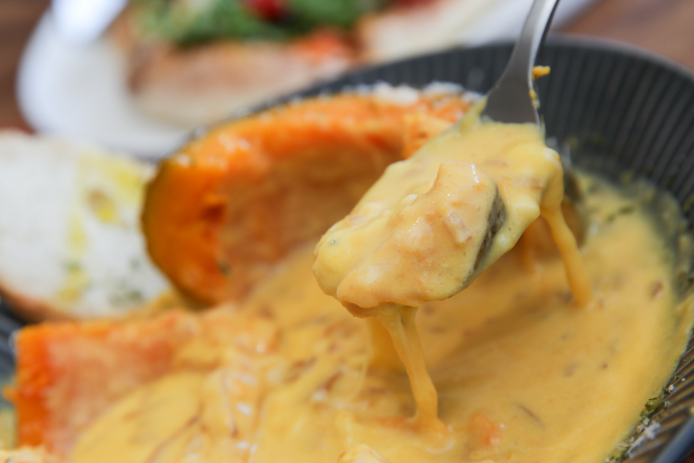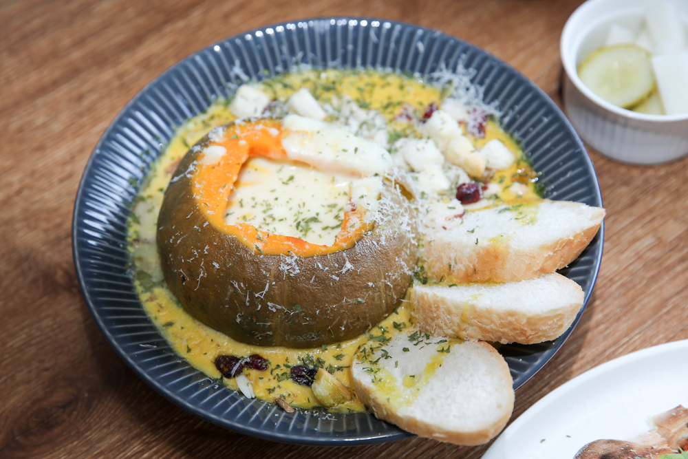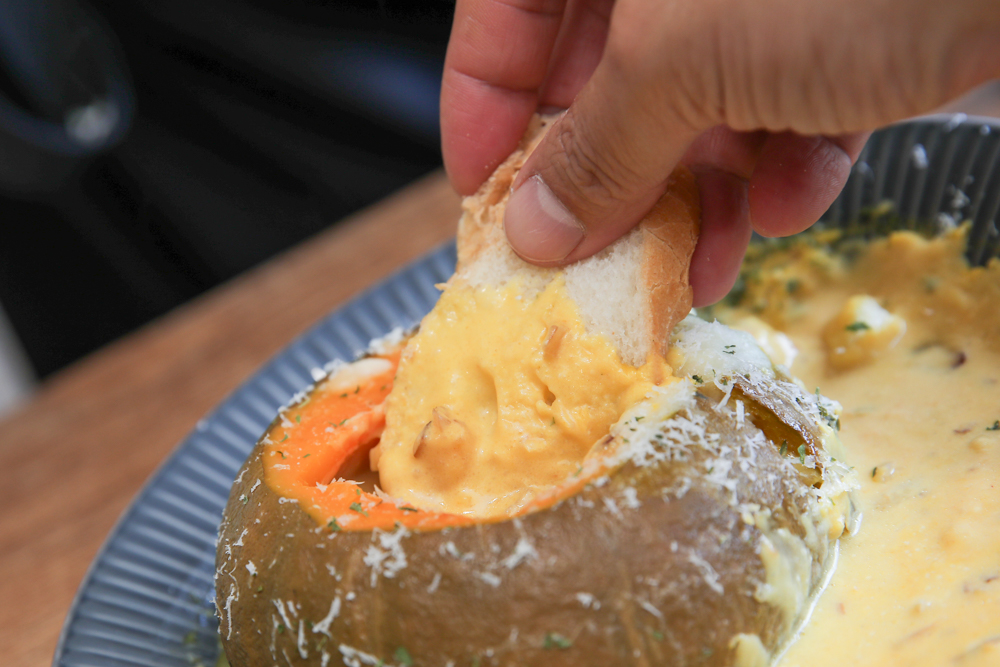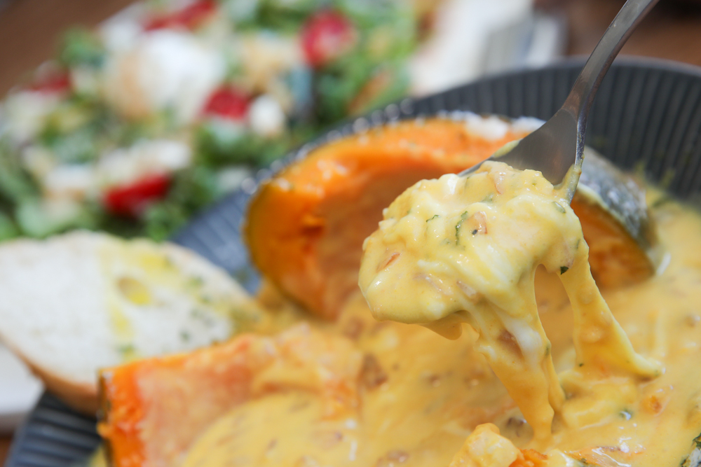 김해 맛집 양식당 어반파머스에서 처음 맛보는 단호박스프! 속을 비워낸 단호박이 통째로 들어가있는데 그 속은 모짜렐라 치즈와 스프가 가득 들어있다.