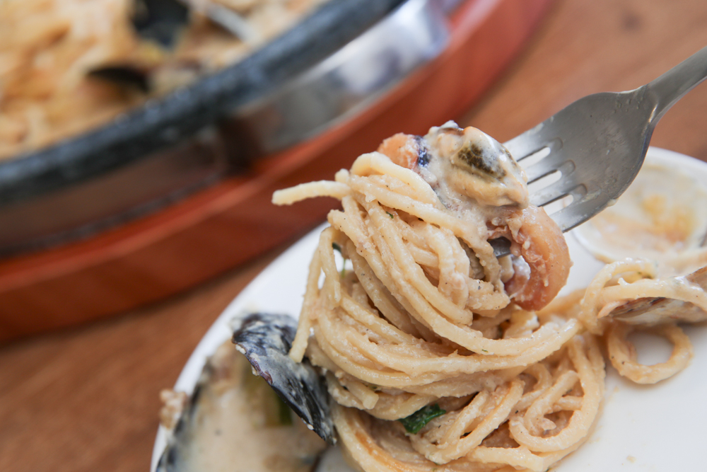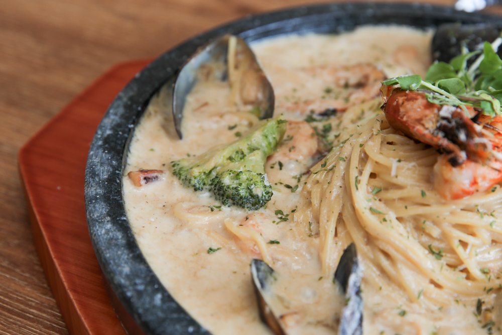 돌판 해물크림파스타는 등장부터 예사롭지 않았다. 지글지글 소리와 함께 고소한 크림향이 물씬 풍기는데~ 레스토랑에서 흔하게 보던 파스타의 풍경과는 사뭇 다른 느낌이라 어떤맛일지 기대가 된다.