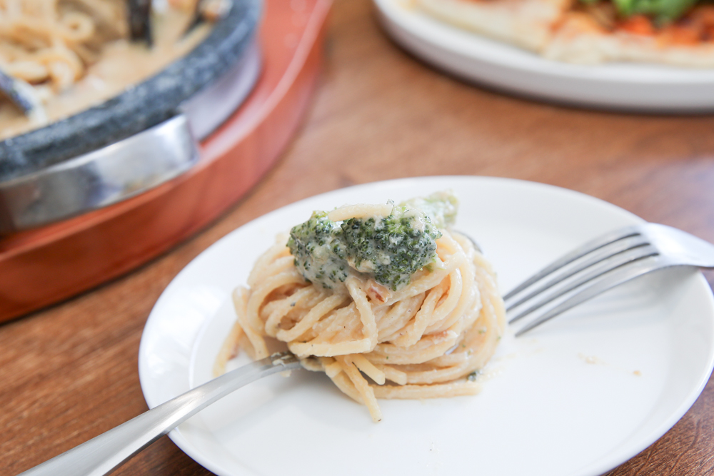 느끼한맛이 생각날때나 고소한 크림 파스타를 좋아하는 사람이라면 한번쯤 꼭 챙겨서 먹어봐야할 메뉴가 아닐까 싶다. 꾸덕함이 정말 진하게 느껴질 뿐 아니라 파스타면이 돌판에서 한번 더 지글지글 볶아지듯이 익어서 면에서 느껴지는 탄력적인 식감이 좋았다.